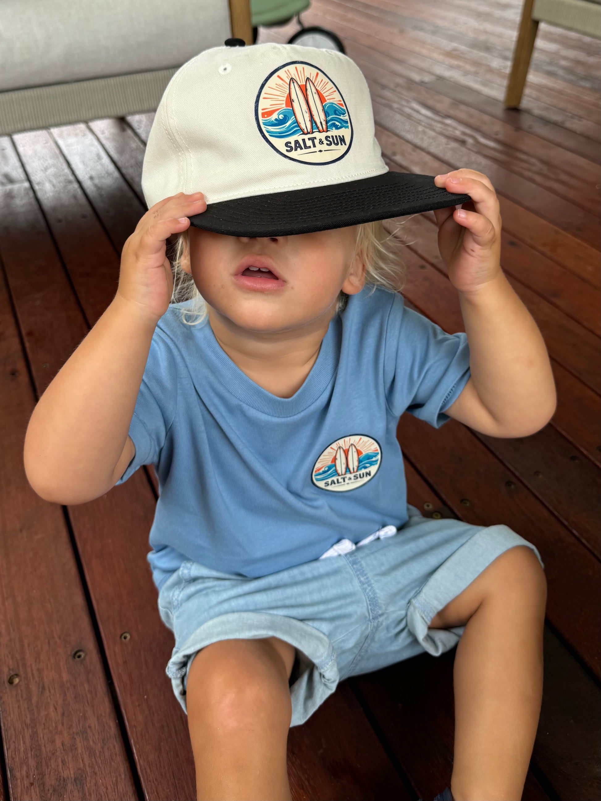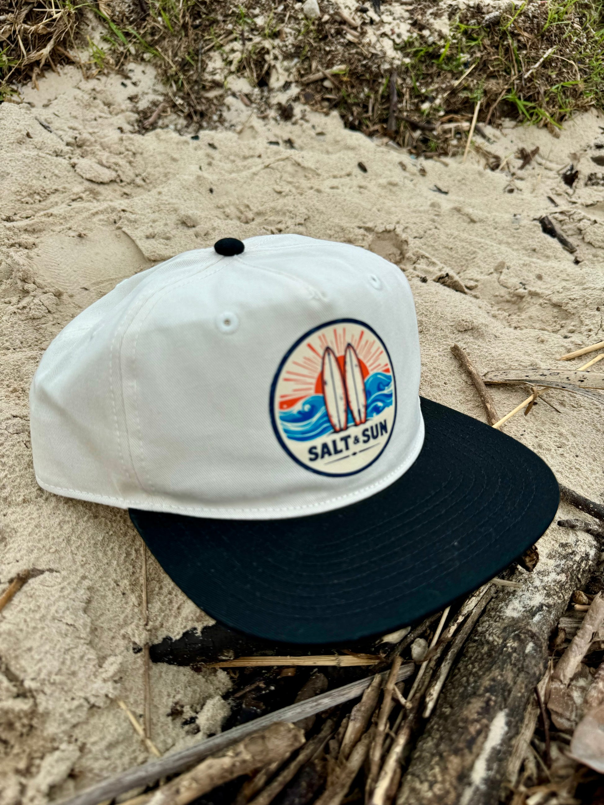 Our black and white flat brim cap is crafted from 100% cotton, feat. our board logo.