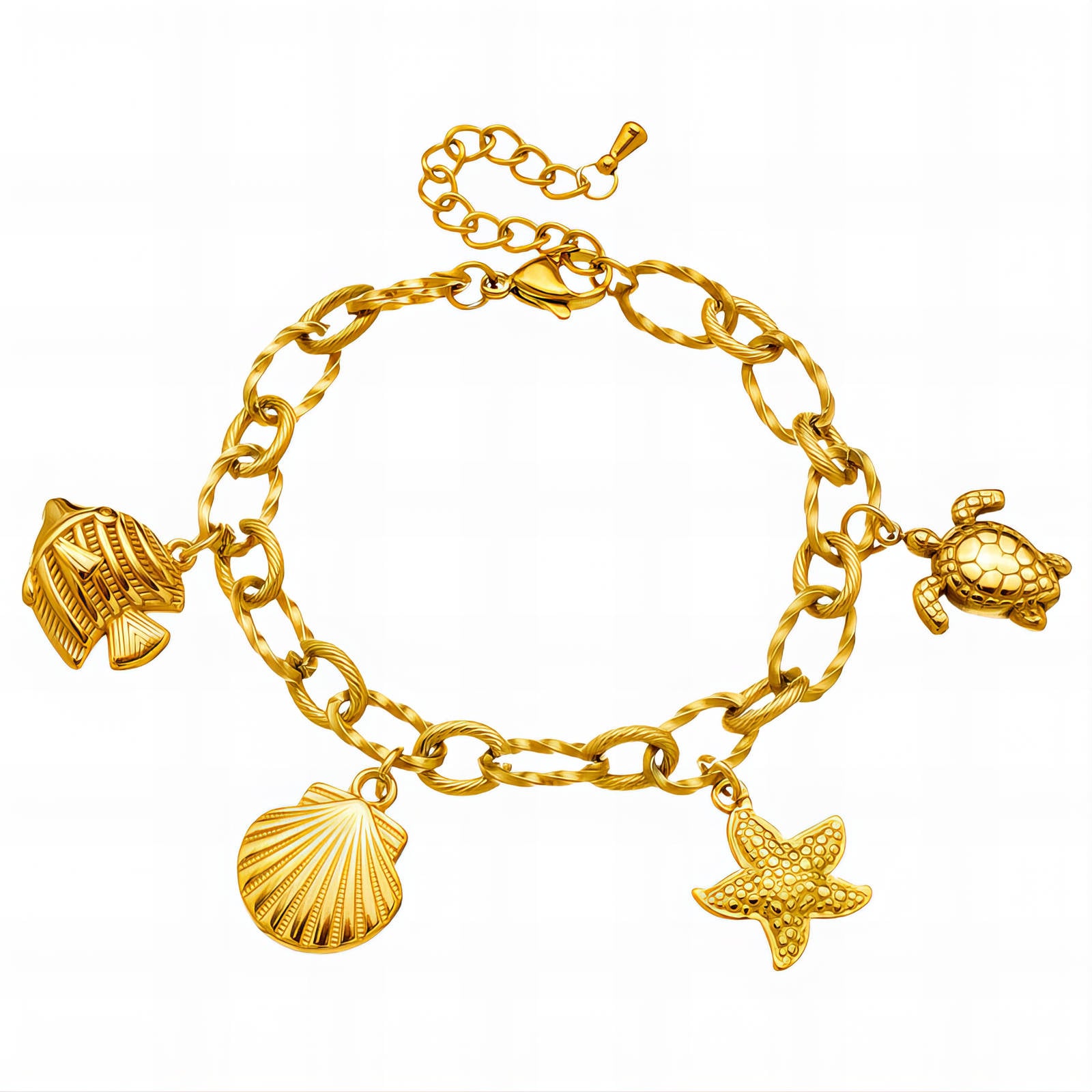 Our gorgeous 18k gold pvd plated stainless steel charm bracelet, featuring fun ocean charms.