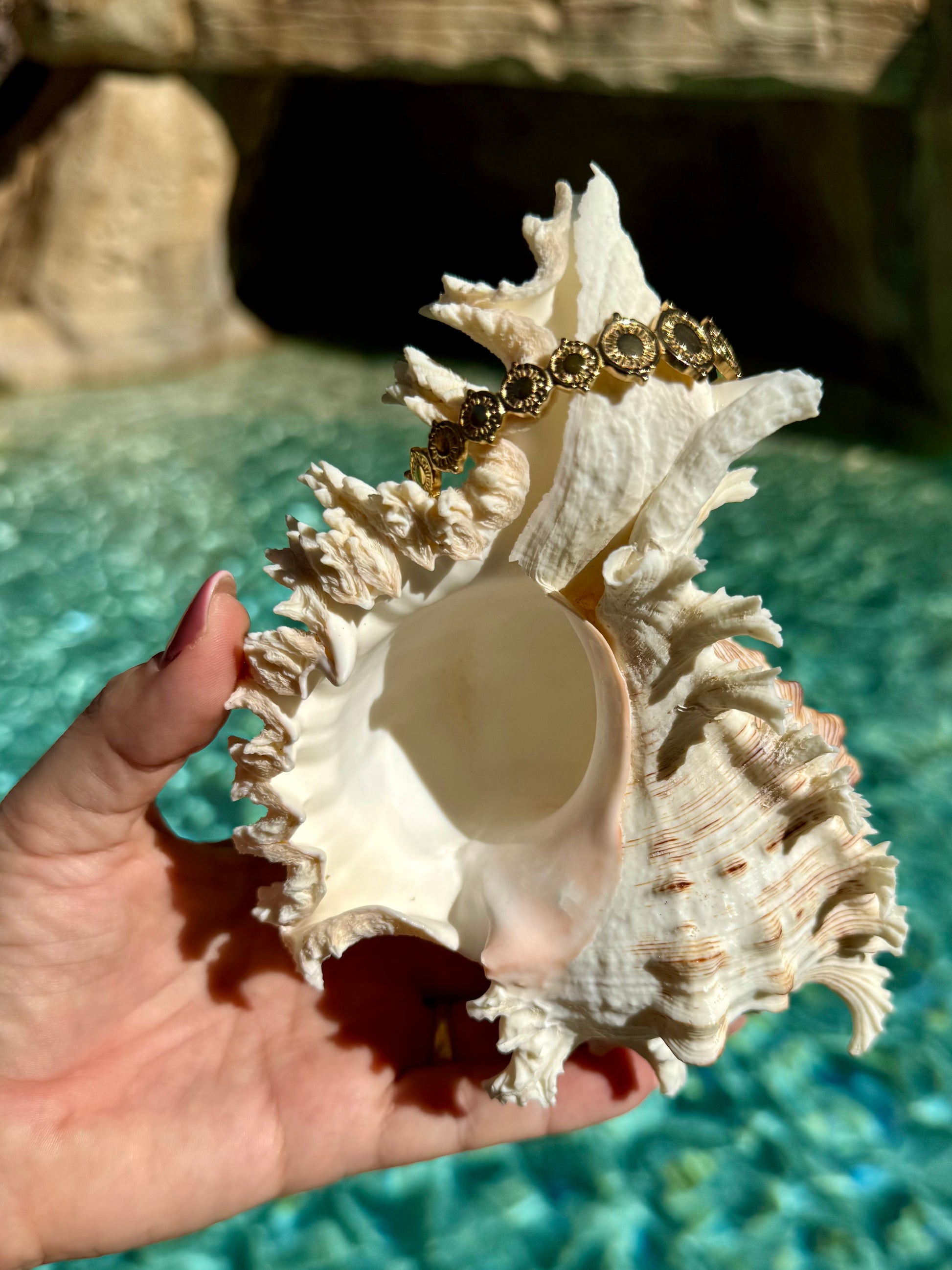 Our gorgeous, adjustable 18k plated stainless steel sun bangle.