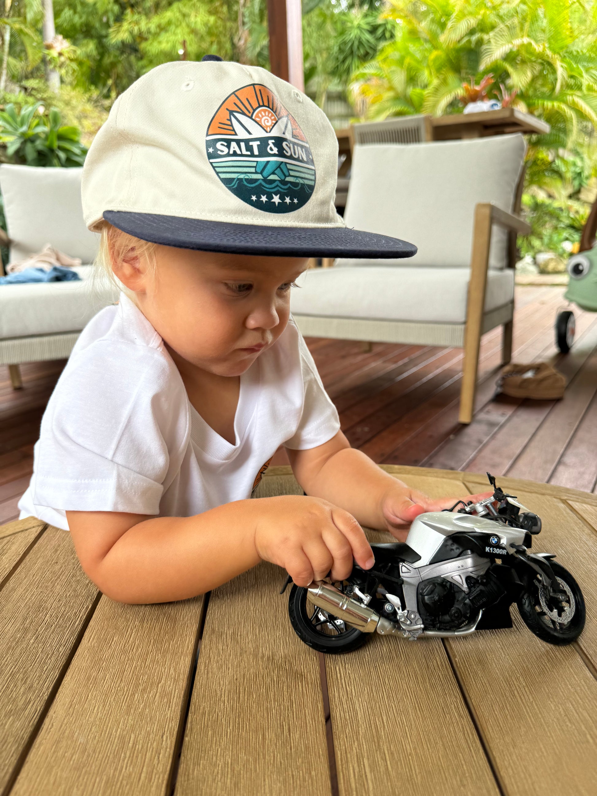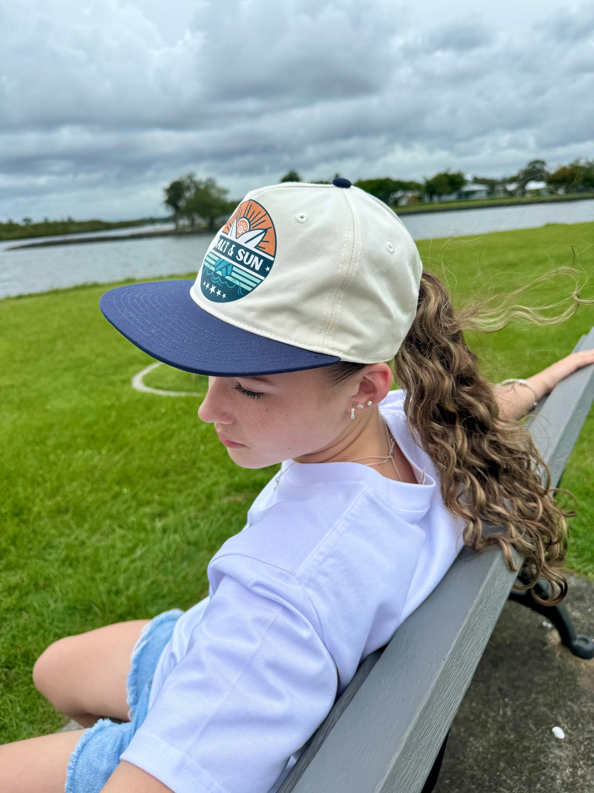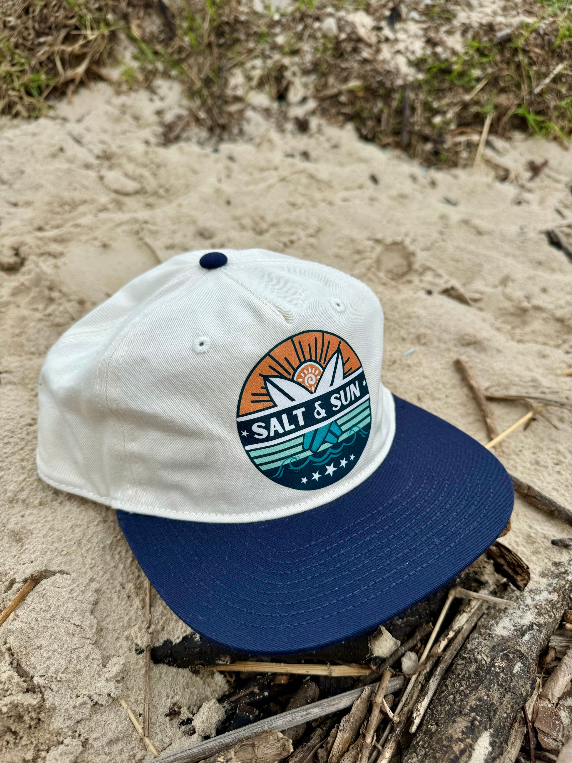 Our white and navy flat brim cap is crafted from 100% cotton, feat. our surf’s up logo.