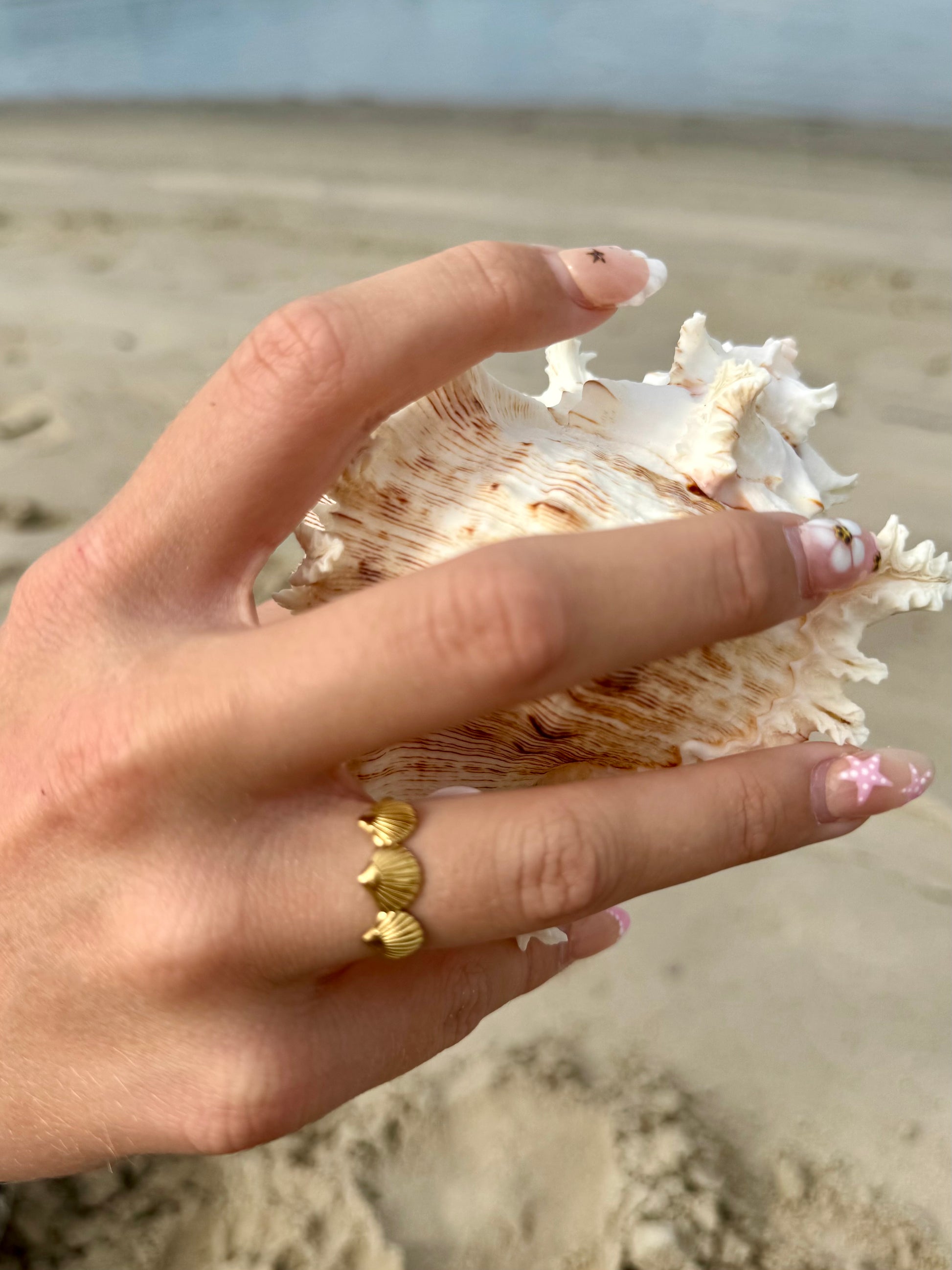 A gorgeous 18k gold pvd plated stainless steel adjustable ring, featuring 3 shells.